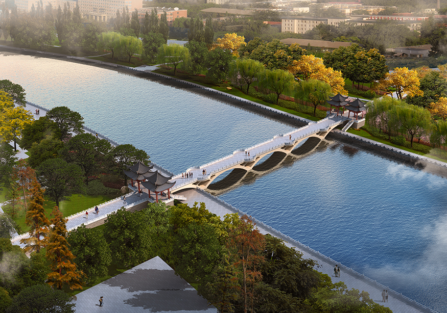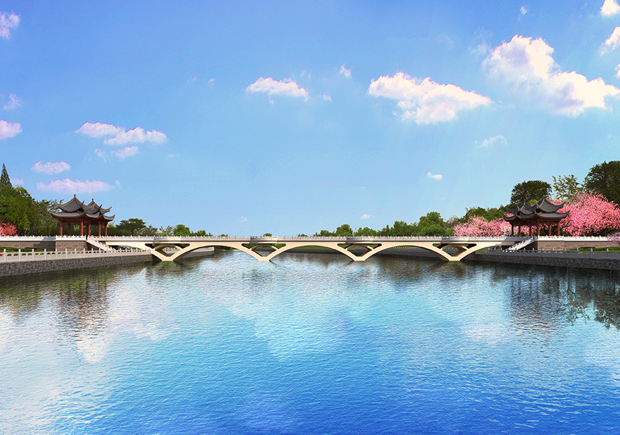 本方案為五孔景觀仿石拱橋形式,中間主河道內(nèi)采用凈跨20+25+20m的三跨連拱形式,在兩側(cè)河漫灘游步道位置分別設(shè)置一孔凈跨5m的小拱供行人從下面通過,橋梁全長在130m左右,橋?qū)?m。在靠近橋頭部位將橋面向兩側(cè)加寬在其上設(shè)置涼亭,兩頭共四座,在橋梁的中跨同樣設(shè)置一座涼亭,形成五亭橋;橋中與橋頭的涼亭之間采用連廊連接,亭廊相連,形成風雨橋,在橋上雨天可以躲避風雨,晴天可以遮陽納涼。為方便行人從游步道上下橋梁,在橋頭涼亭面向游步道的一側(cè),設(shè)置1.5m寬的踏步,將橋面與游步道溝通連接起來。
