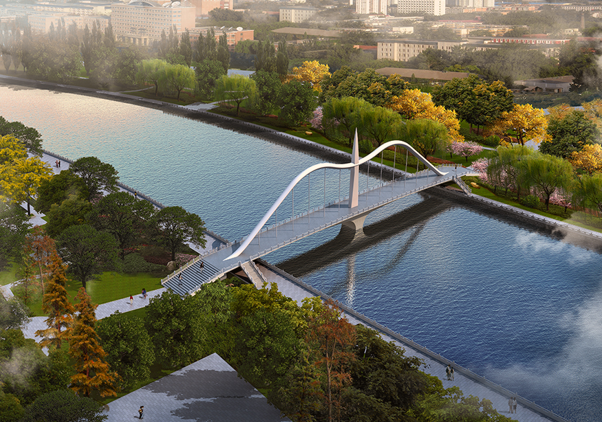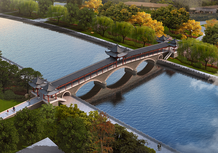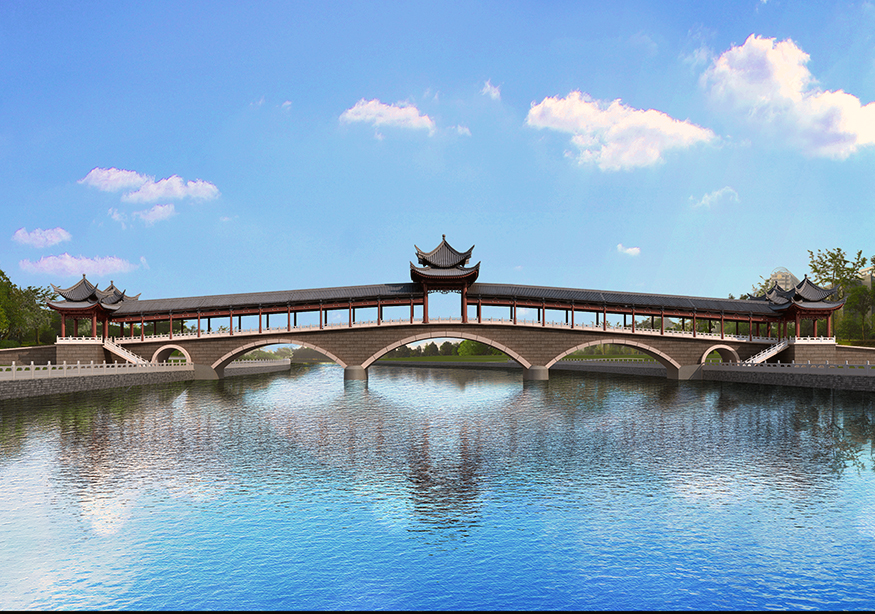 橋上亭廊形式采用江南園林風格形式,配合下部的景觀仿石拱橋,典型的江南水鄉(xiāng)風格;為體現(xiàn)當?shù)孛晒抛宓奶攸c,可在橋梁欄桿欄板側(cè)面及亭廊頂?shù)南虏康窨獭⒗L制一些能夠體現(xiàn)蒙古族文化特點的圖案,如騎射、摔跤等。江南文化與蒙古文化在橋上的相互融合統(tǒng)一,充分體現(xiàn)了援建的友誼。