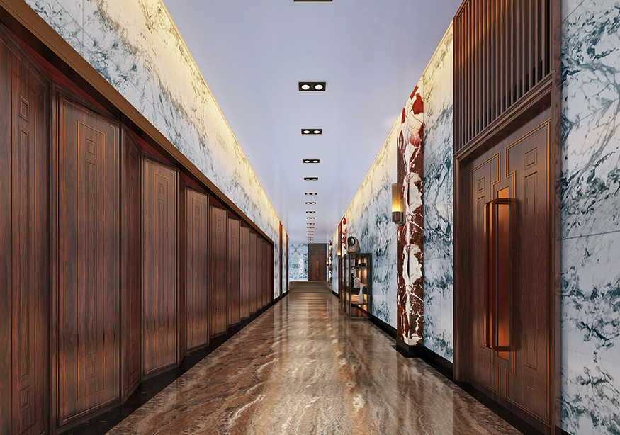 以朱砂的棕紅色為主色調,配以奢華的裝潢、大氣的全無柱式挑高設計。