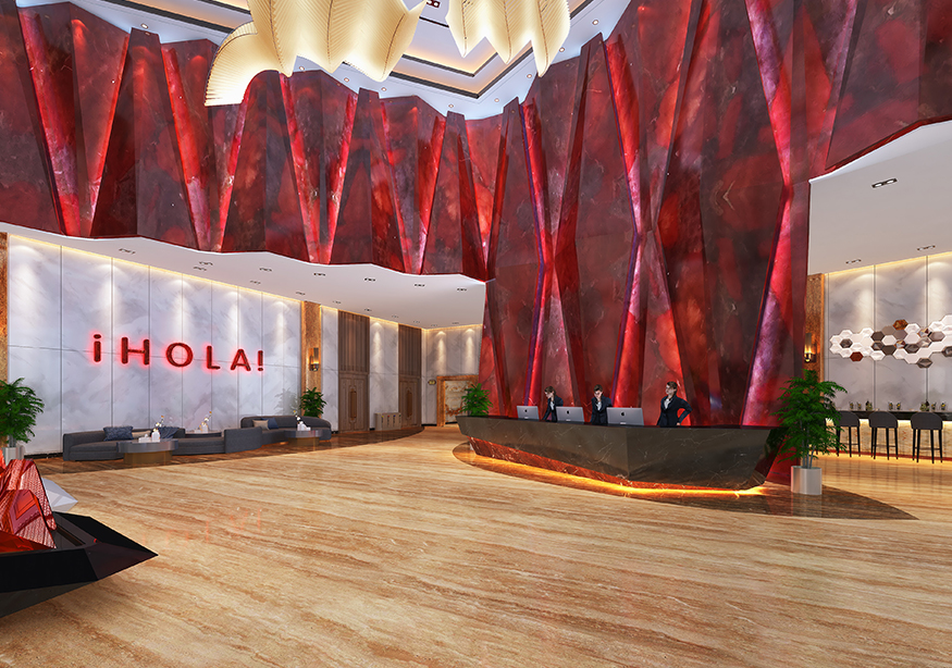 酒店大堂7.5米的挑空設計映入眼簾。酒店大堂面積近1000平方米,內部裝修風格融入了西方的巴塞羅元素,
